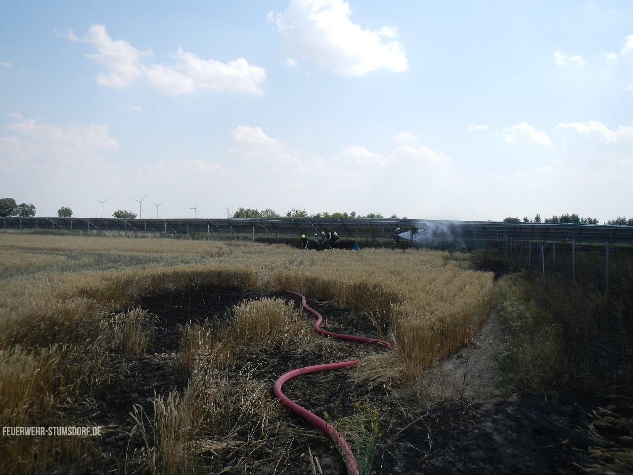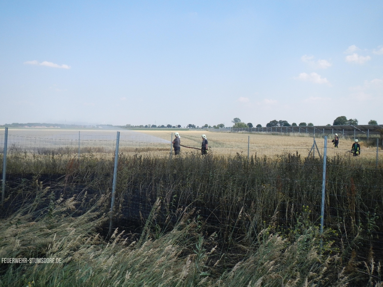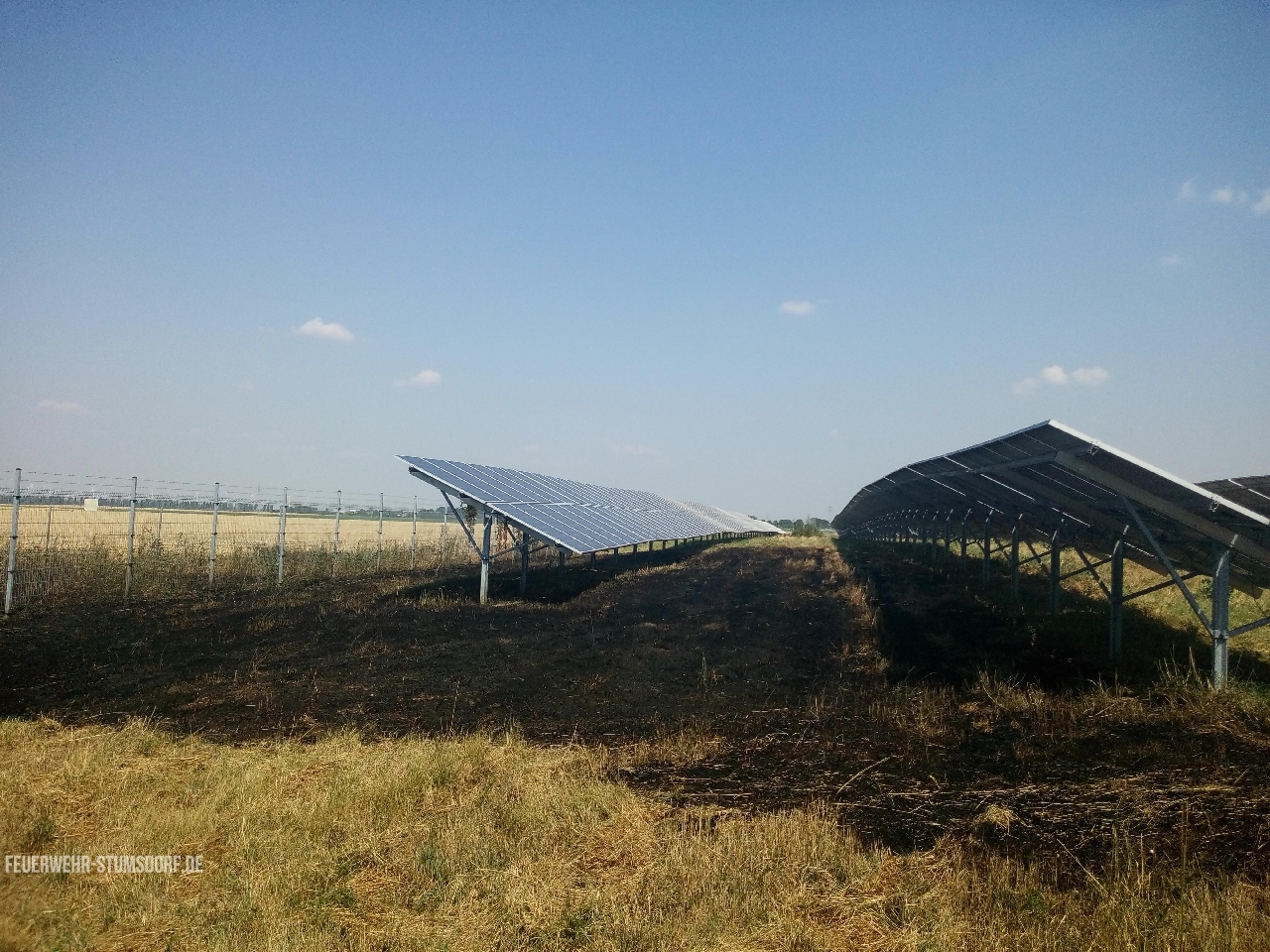 Ein Trupp ging mit dem ersten Rohr zur Brandbekämpfung in das Feld vor, um die Ausbreitung zu verhindern. Ein weiterer Trupp bekämpfte den Ödlandbrand. Nachdem das Feuer im Feld eingedämmt war, ging der Trupp weiter zur Brandbekämpfung in die Photovoltaikanlage und wurde durch die nachalarmierten Kräfte unterstützt.