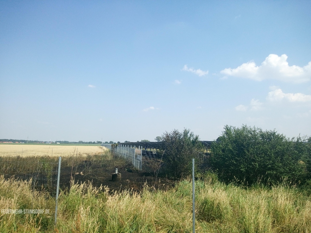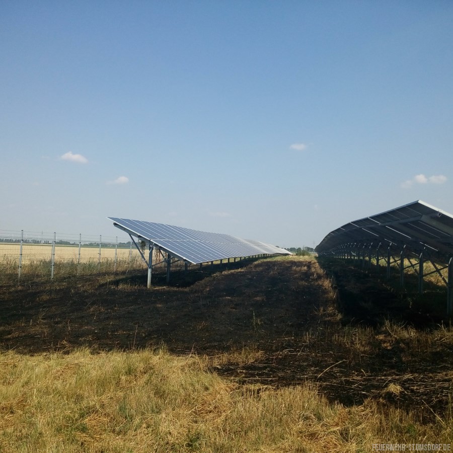 Vor Ort angekommen, stellte sich heraus das Ödland neben der L141 brannte. Das Feuer war bereits auf ein angrenzendes Feld und die Photovoltaikanlage übergegriffen. Aufgrund dessen wurden die Kräfte aus Sandersdorf und Brehna nachalarmiert.